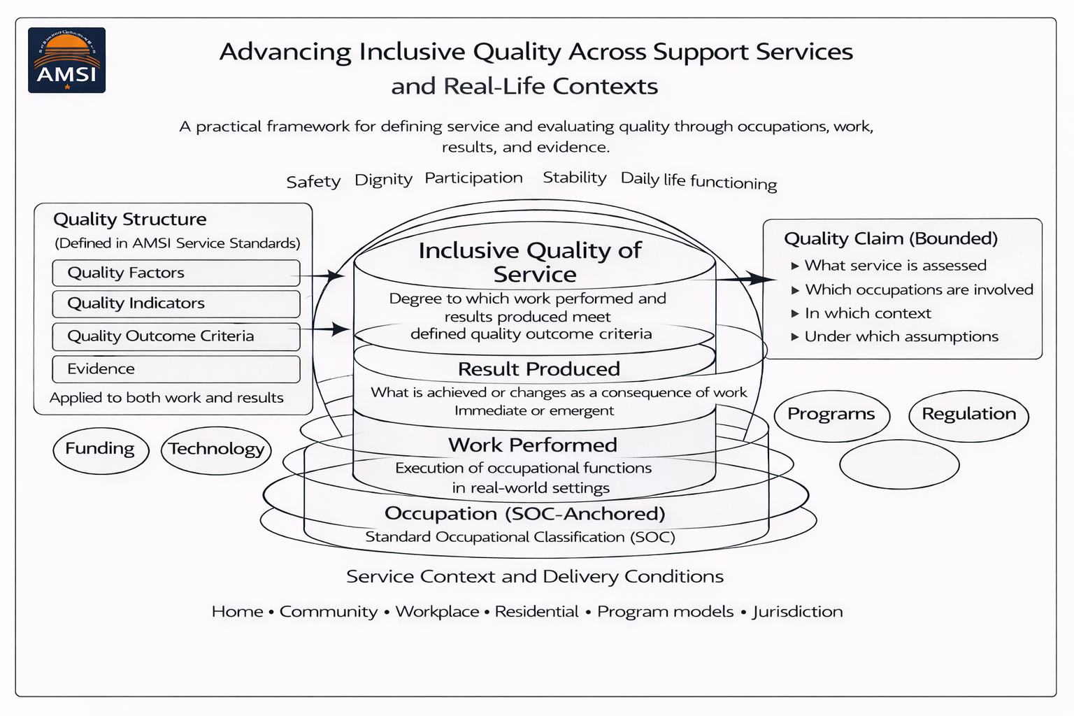 This framework shows how inclusive quality in support services is built from the ground up — starting with nationally defined occupations, moving through the work performed and results produced, and only then evaluating quality through defined factors, indicators, and evidence.